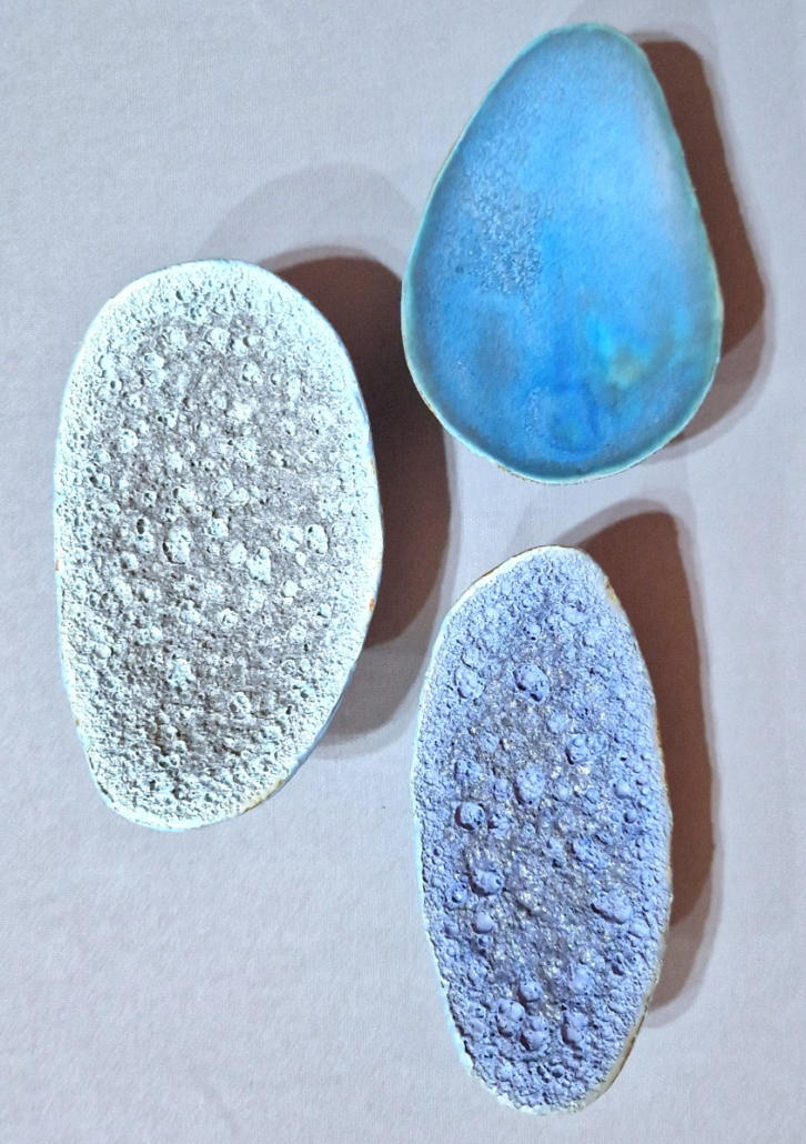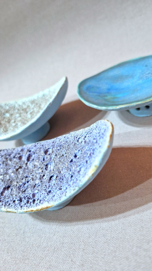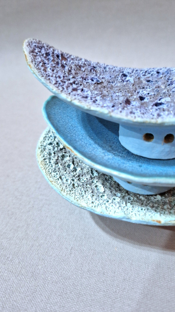 The pieces feature various stoneware glazes in gloss, satin, dry, reactive and volcanic/crater glazes as well as engobe. No two pieces are the same.